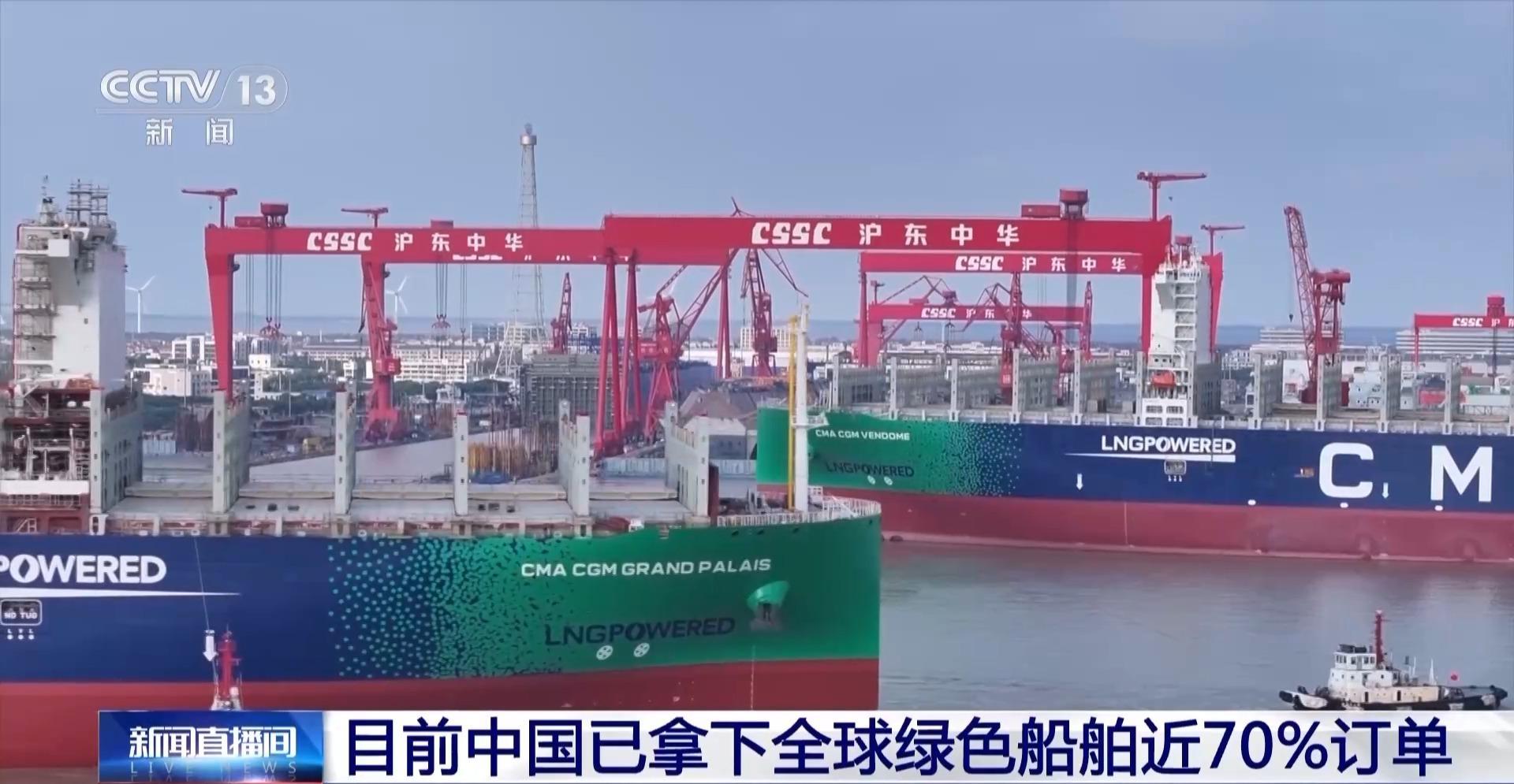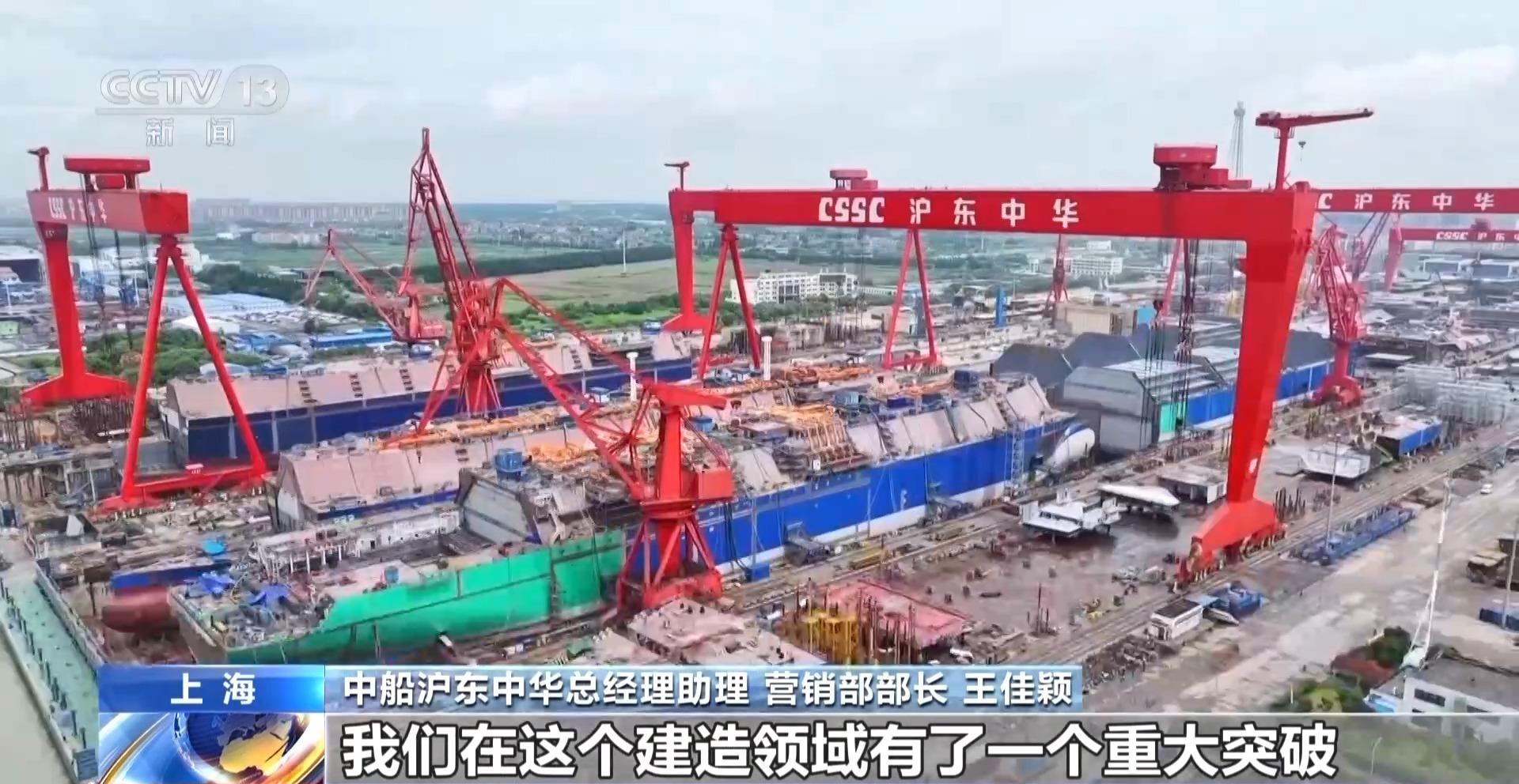 在中船滬東中華造船廠,記者看到,今年這家船企接到的綠色船舶訂單占比已經超過80%,是近5年最高水平。船型覆蓋集裝箱船、LNG運輸船等主力船型,燃料也從液化天然氣拓展到了甲醇、液氫等,高端化、綠色化已經成為中國造船的新名片。