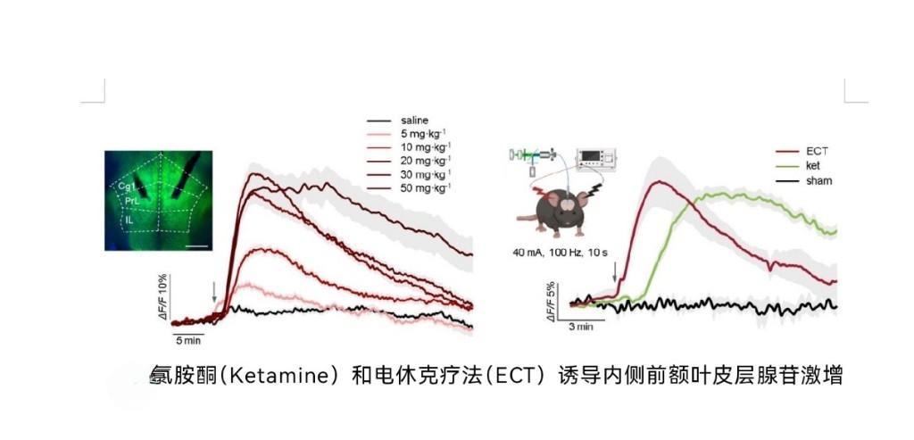 研究團(tuán)隊借助基因編碼腺苷探針GRABado和光纖光度測量技術(shù),實(shí)現(xiàn)了小鼠腦區(qū)腺苷濃度的實(shí)時監(jiān)測。實(shí)驗發(fā)現(xiàn),氯胺酮和電休克治療均能快速且持續(xù)升高小鼠內(nèi)側(cè)前額葉皮層與海馬體的腺苷水平,而這一區(qū)域正是情緒調(diào)節(jié)的關(guān)鍵腦區(qū)。通過遺傳學(xué)與藥理學(xué)驗證,研究團(tuán)隊確認(rèn)腺苷A1和A2A受體是抗抑郁效應(yīng)的必需條件,敲除或阻斷這兩種受體后,兩種療法的抗抑郁作用均完全消失。
