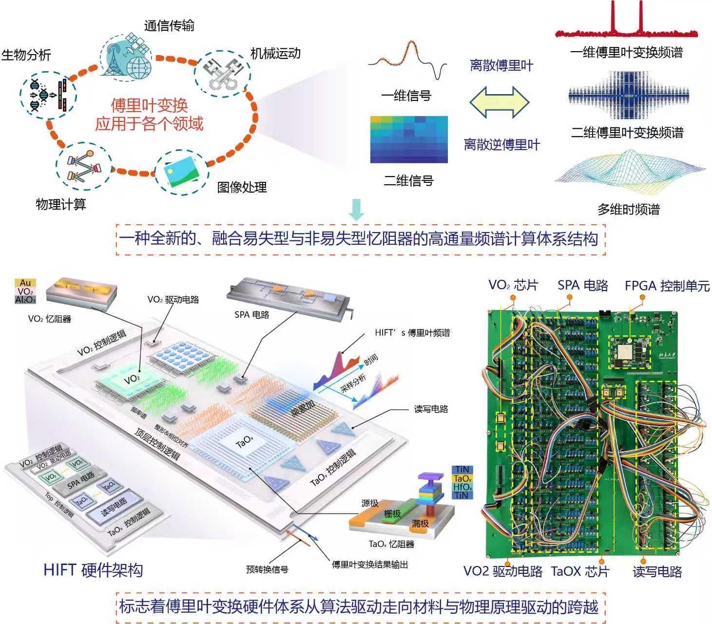 論文共同第一作者兼通訊作者、北京大學(xué)人工智能研究院研究員陶耀宇介紹,傅里葉變換作為AI領(lǐng)域的“底層引擎”,其核心功能是將復(fù)雜的信號(聲音、圖像、時(shí)間序列)轉(zhuǎn)換為頻率的語言。在人工智能中,這種能力被廣泛應(yīng)用于特征提取、降噪、壓縮以及計(jì)算優(yōu)化等方面。它是人工智能、通信系統(tǒng)、科學(xué)計(jì)算、腦機(jī)接口等海量實(shí)際應(yīng)用場景中使用最為廣泛的算子之一,也是后摩爾新器件實(shí)用化破題的關(guān)鍵抓手??蒲袌F(tuán)隊(duì)創(chuàng)新地將易失性氧化釩器件與非易失性氧化鉭/鉿器件進(jìn)行系統(tǒng)級異質(zhì)集成,充分發(fā)揮了兩類后摩爾新器件在頻率生成調(diào)控與存算一體方面的互補(bǔ)優(yōu)勢,在保證傅里葉變換精度、降低計(jì)算功耗的前提下,可將吞吐率從當(dāng)前100GS/s級別提升至500GS/s以上。
