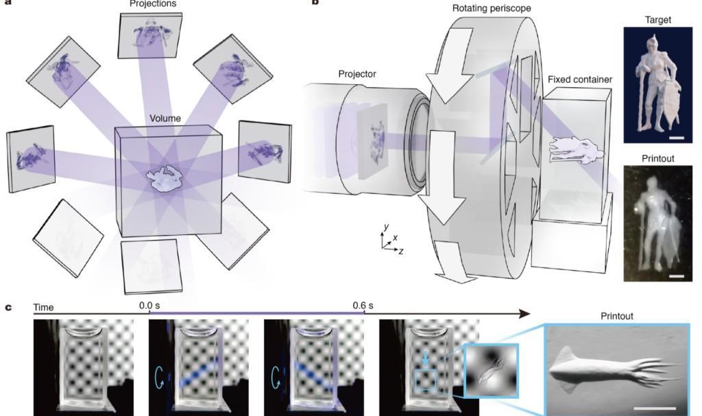 “被寄予厚望的體積打印在速度上具備天然優(yōu)勢(shì),是因?yàn)橐淮握樟亮苏麄€(gè)三維體進(jìn)行光固化反應(yīng)。然而,其雖理論上可全三維同步固化,卻被兩大難題卡死?!眳羌蚊暨M(jìn)一步解釋?zhuān)苌湫?yīng)讓高精度光束僅能在極小范圍聚焦,如同長(zhǎng)焦鏡頭只有焦點(diǎn)清晰,物體稍大精度就急劇衰減;傳統(tǒng)體積打印必須旋轉(zhuǎn)樣本,高速運(yùn)轉(zhuǎn)帶來(lái)的振動(dòng)、材料流動(dòng),直接破壞成型精度。