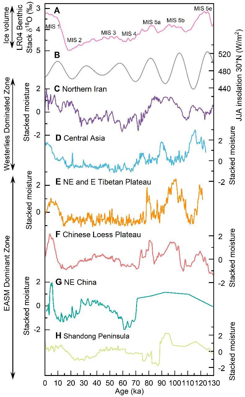 研究發(fā)現(xiàn),在冰期—間冰期時間尺度上,亞洲濕度變化總體表現(xiàn)為冰期降低、間冰期升高的同相位變化模式。但在間冰期內(nèi)部,西風影響區(qū)與季風影響區(qū)降水呈現(xiàn)顯著不同步演化。研究指出,軌道尺度上亞洲降水變化的核心控制因素是地表溫度變化,太陽輻射驅(qū)動的大氣環(huán)流演變是造成降水不同步的主導機制。