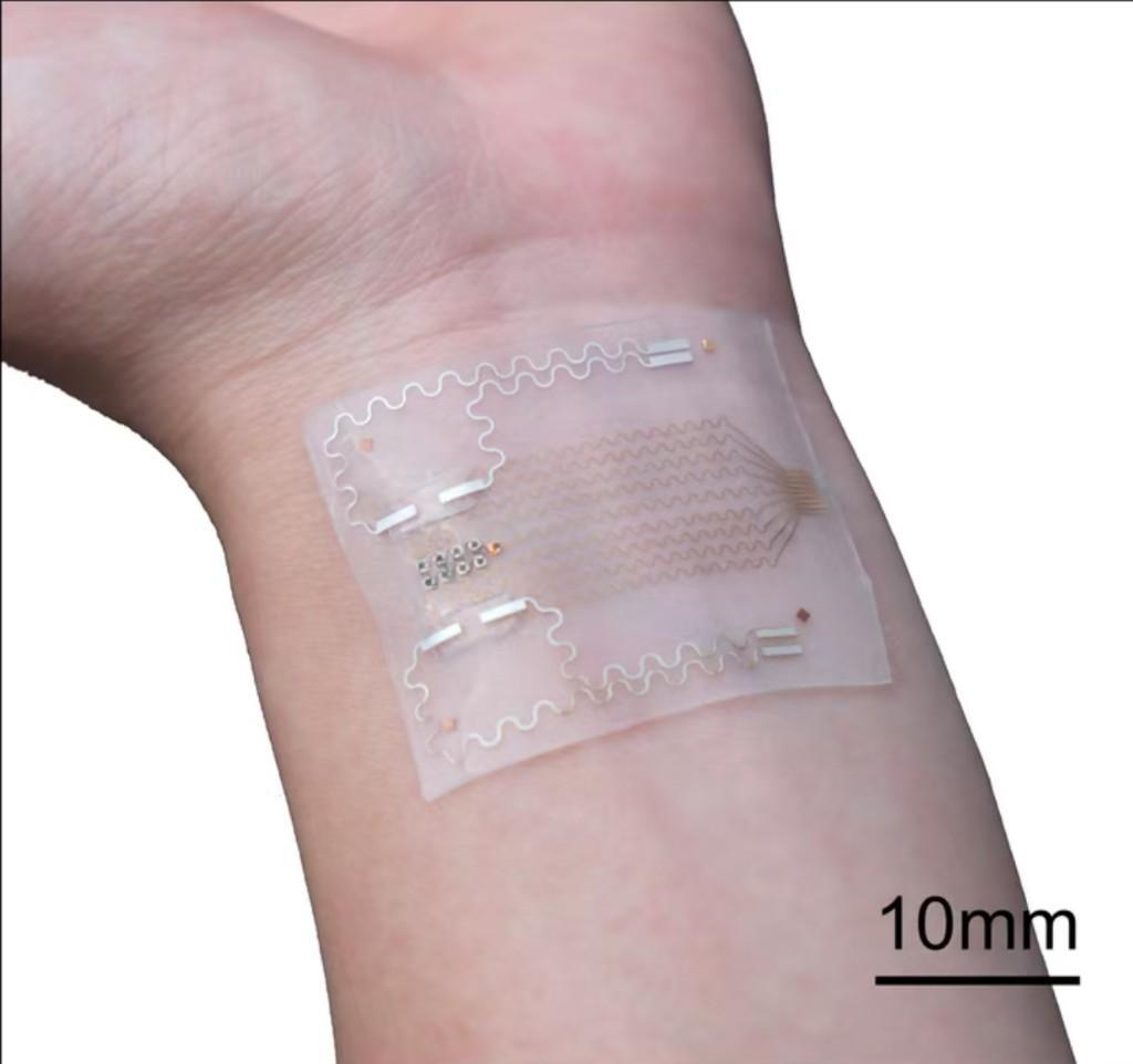 該微系統(tǒng)大小只有一枚硬幣左右,整體厚度不到半毫米,比一張銀行卡還薄,重量也不足1克。它采用了柔軟的硅橡膠材質(zhì),可以像皮膚一樣被拉伸,最大拉伸達(dá)40%,能夠緊密貼合在手腕等曲面皮膚部位。該設(shè)備疏水防汗、生物相容性優(yōu)異,連續(xù)工作3小時(shí)溫度保持穩(wěn)定,可滿足長期不間斷監(jiān)測需求。