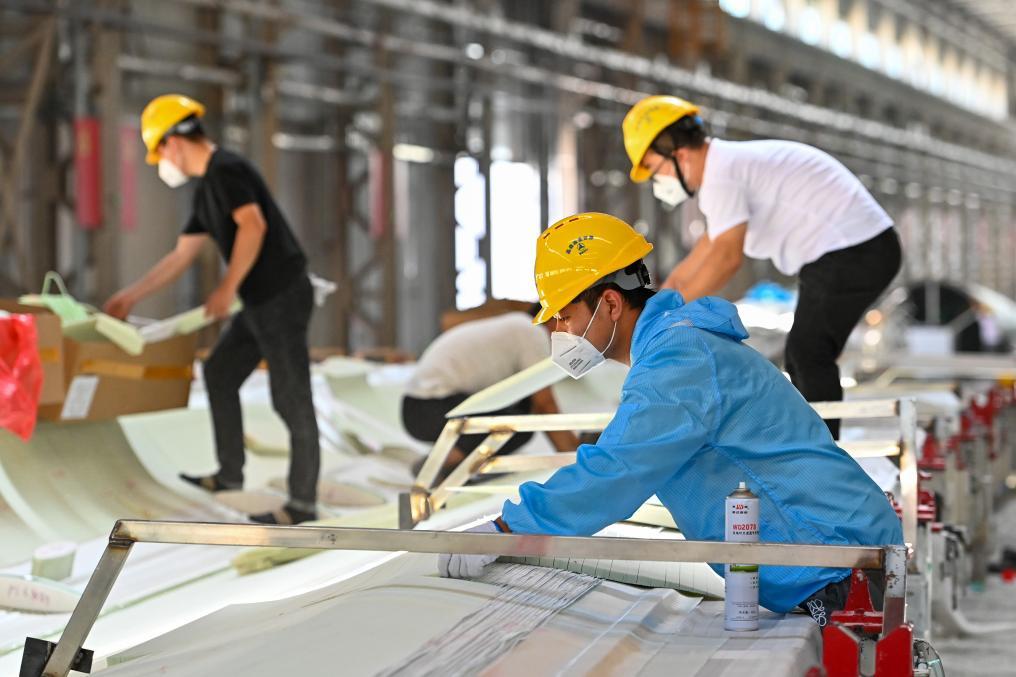 這是2023年7月22日拍攝的在新疆塔城重點(diǎn)開(kāi)發(fā)開(kāi)放試驗(yàn)區(qū)先行發(fā)展區(qū)三一(塔城)風(fēng)電設(shè)備有限公司,工人在葉片成型車間忙碌。新華社記者丁磊 攝