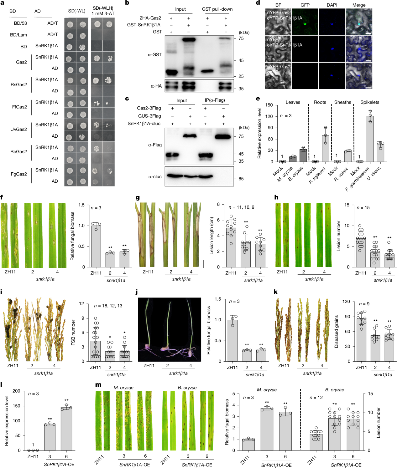 團隊進一步發(fā)現(xiàn),這些真菌在侵染過程中會釋放特殊蛋白Gas2。該特殊蛋白與水稻的感病蛋白(SnRK1β1A)結(jié)合,并將該感病蛋白轉(zhuǎn)運到水稻細胞核里,誘導SnRK1β1A基因的高表達,從而幫助真菌破壞水稻的自身防御,讓水稻更易感病。