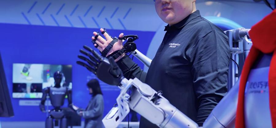 2026中關(guān)村論壇年會(huì)上,工作人員展示靈巧手通過人類動(dòng)作提取數(shù)據(jù)。主辦方供圖