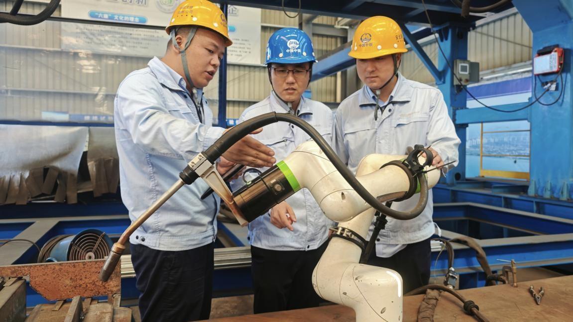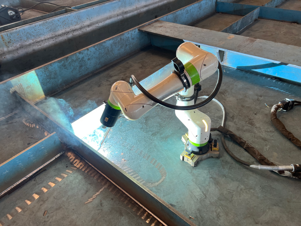 在鋼板梁核心生產(chǎn)環(huán)節(jié),項(xiàng)目團(tuán)隊(duì)針對(duì)工形主焊縫施工,全面采用懸臂埋弧焊接專機(jī)焊接,不僅實(shí)現(xiàn)了超長焊縫的自動(dòng)化連續(xù)作業(yè),大幅提升焊接效率,更實(shí)現(xiàn)了焊接質(zhì)量的全程可控與穩(wěn)定,為生產(chǎn)進(jìn)度的穩(wěn)步推進(jìn)提供了核心裝備支撐。針對(duì)鋼板梁加勁肋密集、焊接點(diǎn)位多、外觀質(zhì)量要求高的施工難點(diǎn),團(tuán)隊(duì)在行業(yè)內(nèi)率先應(yīng)用協(xié)作機(jī)器人開展加勁肋焊縫焊接作業(yè),突破了傳統(tǒng)焊接工藝需提前導(dǎo)入圖紙信息編程的技術(shù)限制,實(shí)現(xiàn)了無需預(yù)編程即可完成復(fù)雜焊縫自動(dòng)化焊接的目標(biāo),以數(shù)字化技術(shù)破解了復(fù)雜鋼橋梁復(fù)雜部位焊縫自動(dòng)化焊接的制造難題。