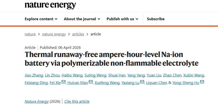 4月6日,中國(guó)科學(xué)院物理研究所胡勇勝團(tuán)隊(duì)在《自然·能源》發(fā)表重磅成果:該團(tuán)隊(duì)成功開(kāi)發(fā)出一種具有自保護(hù)功能的可聚合不燃電解質(zhì)(PNE),全球首次在安時(shí)級(jí)鈉離子電池中實(shí)現(xiàn)徹底阻斷熱失控。