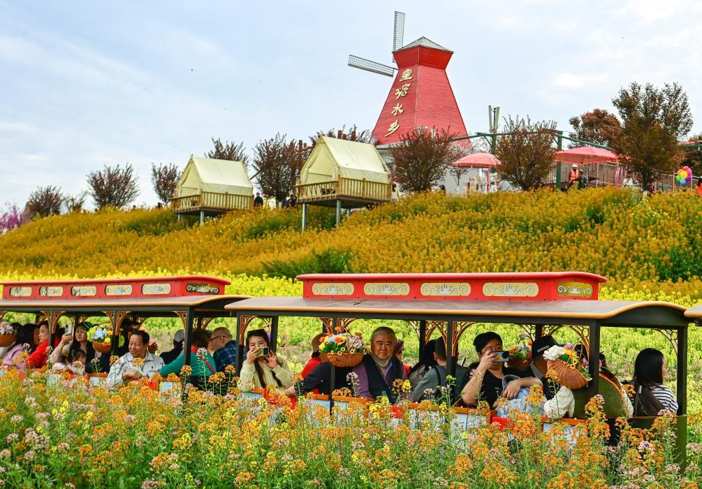 3月27日,游客在漢中市漢臺(tái)區(qū)老君鎮(zhèn)黃塘村黃塘水鄉(xiāng)景區(qū)乘坐小火車觀光游覽。新華社記者 鄒競一 攝