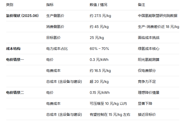 電力成本是綠氫成本的核心,占比達(dá)60%—70%。陽光氫能有限公司副總裁方偉測(cè)算,電價(jià)0.3元/千瓦時(shí),僅電費(fèi)就約16.5元/千克,疊加設(shè)備與建設(shè)成本后總成本超20元/千克;若電價(jià)降至0.15元/千瓦時(shí),電費(fèi)可壓縮至10元/千克以內(nèi),總成本有望控制在15元/千克左右。
