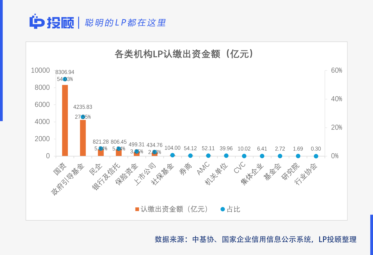 另一方面,出資10億元及以上的288家機(jī)構(gòu)LP中,國資170家,政府引導(dǎo)基金73家,二者合計(jì)占比高達(dá)84.38%,而民企和上市公司僅14家,占比4.86%;出資50億元及以上的39家機(jī)構(gòu)LP中,國資22家,政府引導(dǎo)基金11家,二者合計(jì)占比高達(dá)84.62%;而民企及上市公司僅1家。頭部出資主體中,國資和政府引導(dǎo)基金已成為出資主力,實(shí)力遠(yuǎn)高于民企及上市公司等市場(chǎng)化LP。