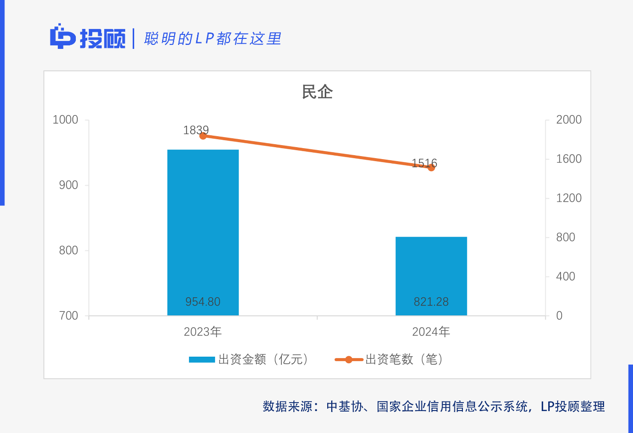 機(jī)構(gòu)LP數(shù)量方面,2024年,4556家機(jī)構(gòu)LP中,民企和上市公司共1673家,較2023年(1946家)同比減少了14.03%,二者在機(jī)構(gòu)LP總量中占比為36.72%(2023年44.45%)。出資筆數(shù)方面,2024年,民企和上市公司累計(jì)出資1833筆,較2023年(2153筆)同比減少14.86%,二者在出資筆數(shù)總數(shù)(6096筆)中合計(jì)占比30.07%(2023年38.01%)。出資金額方面,2024年,民企和上市公司累計(jì)認(rèn)繳出資1256.04億元,較2023年(1392.70億元)同比減少9.81%;二者在認(rèn)繳出資總額(15375.90億元)中占比8.17%(2023年8.95%)。