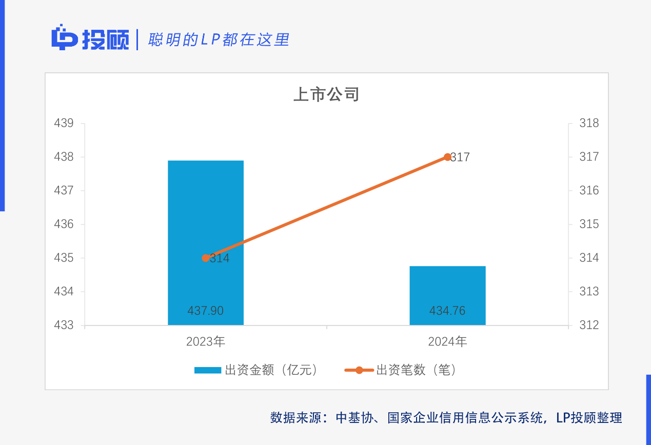 2024年,LP中民企和上市公司的數(shù)量、出資筆數(shù)、出資規(guī)模都較2023年有一定的下滑。