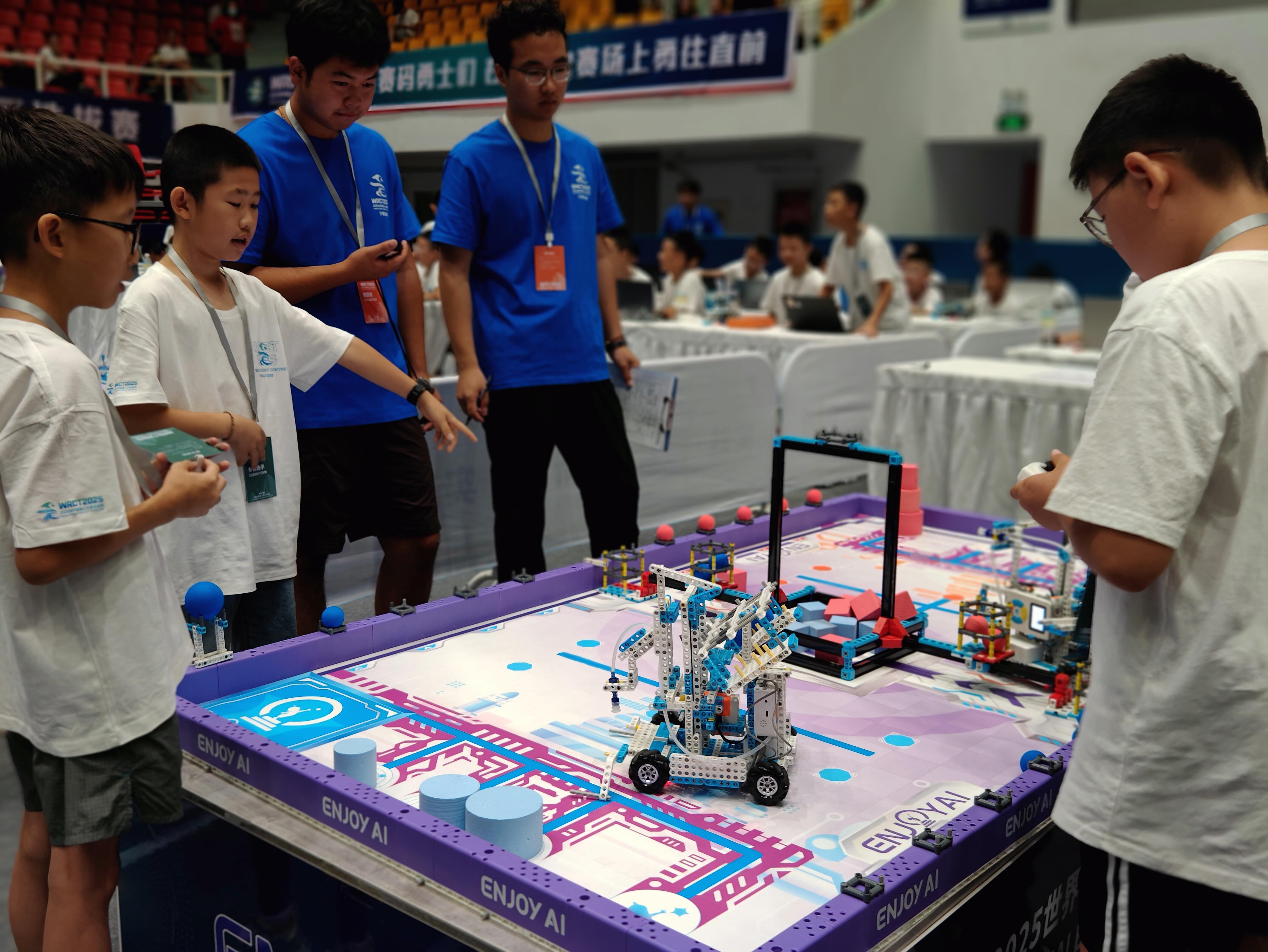 步入現(xiàn)場,參賽小選手或緊盯電腦屏幕,飛速敲擊鍵盤調(diào)整程序;或通過手柄遠(yuǎn)程操控機器人完成搬運、對抗等復(fù)雜任務(wù);或俯身擰緊螺絲、檢查線路,不放過任何一個細(xì)節(jié)。團(tuán)隊成員默契配合、緊密協(xié)作,爭取在有限時間內(nèi)取得佳績。本次比賽設(shè)有MakeX數(shù)智先鋒、WHALESBOT文明啟航、Super AI筑夢星空、MeuroMaster腦機星球等14個賽項,覆蓋從小學(xué)到高中不同年齡段。內(nèi)容緊密結(jié)合人工智能、機器人技術(shù)的前沿發(fā)展,注重考查選手創(chuàng)新設(shè)計、編程控制、機械結(jié)構(gòu)搭建和臨場解決問題的能力。