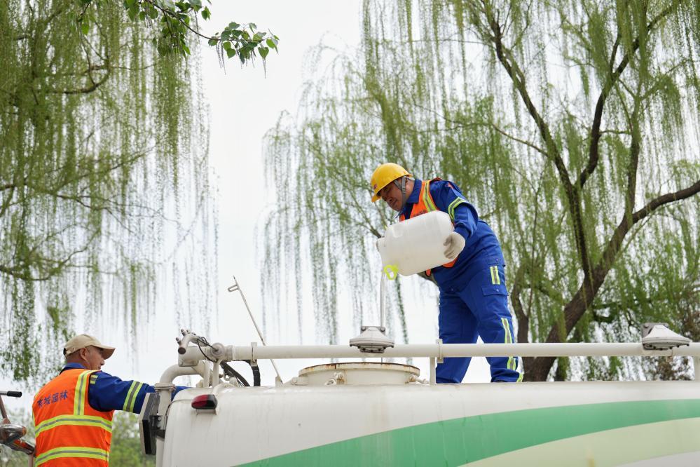 “這是一種無毒無害、環(huán)境友好型的高分子有機物,經(jīng)水稀釋后,用高壓水槍、霧炮車或無人機均勻噴灑在樹冠上。”北京市園林綠化科學(xué)研究院高級工程師車少臣說。