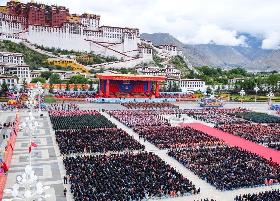 8月21日上午,西藏各族各界干部群眾約2萬人歡聚拉薩市布達拉宮廣場,熱烈慶祝西藏自治區(qū)成立60周年。這是慶祝大會現(xiàn)場。