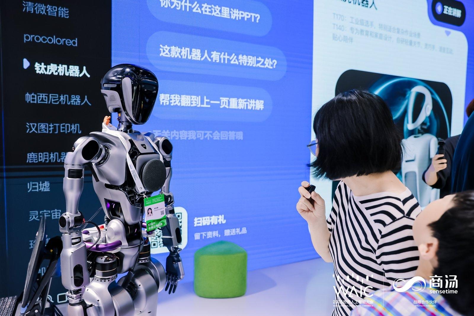 現(xiàn)場(chǎng),一個(gè)會(huì)解說(shuō)PPT的機(jī)器人成為全場(chǎng)焦點(diǎn)。這臺(tái)基于商湯最新日日新V6.5多模態(tài)大模型的人形機(jī)器人,擁有強(qiáng)大的音視頻處理和AI交互能力,可以像人一樣,邊翻頁(yè)講解 PPT邊應(yīng)答觀眾提問(wèn),即便在嘈雜的環(huán)境中,也能完成實(shí)時(shí)互動(dòng),流暢度讓很多現(xiàn)場(chǎng)觀眾拍手稱贊。