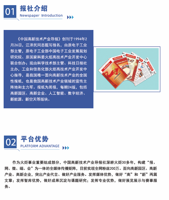 《中國高新技術(shù)產(chǎn)業(yè)導報》創(chuàng)刊于1994年2月26日,江澤民同志題寫報名,由原電子工業(yè)部主管,原電子工業(yè)部中國電子工業(yè)發(fā)展規(guī)劃研究院、原國家科委火炬高技術(shù)產(chǎn)業(yè)開發(fā)中心聯(lián)合創(chuàng)辦;現(xiàn)由科學技術(shù)部主管、科技日報社主辦,工業(yè)和信息化部火炬高技術(shù)產(chǎn)業(yè)開發(fā)中心指導,是我國唯一面向高新技術(shù)產(chǎn)業(yè)的全國性報紙,也是我國高新技術(shù)產(chǎn)業(yè)領(lǐng)域的宣傳主陣地和主力軍。報紙為周報,每期16版,包括高新園區(qū)、高新企業(yè)、人工智能、數(shù)字經(jīng)濟、新能源、新空天等版塊。