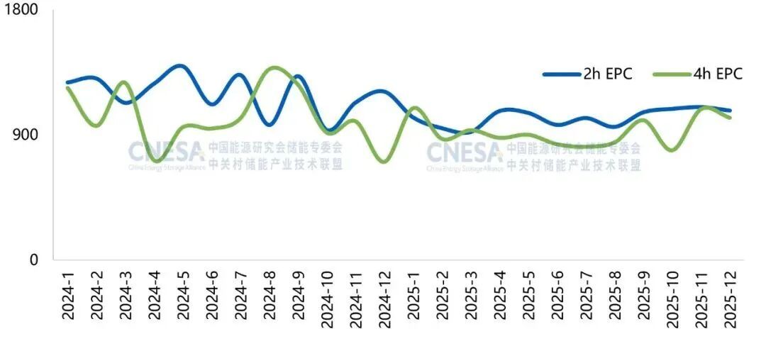 根據(jù)CNESA DataLink全球儲(chǔ)能數(shù)據(jù)庫(kù)的不完全統(tǒng)計(jì),2025年儲(chǔ)能系統(tǒng)(磷酸鐵鋰系統(tǒng),不含用戶側(cè)應(yīng)用)采購(gòu)中標(biāo)價(jià)格在391.14-913.00元/kWh之間,其中不同時(shí)長(zhǎng)系統(tǒng)價(jià)格降價(jià)幅度差異大。0.25C儲(chǔ)能系統(tǒng)價(jià)格下降幅度接近0.5C的兩倍。2025年EPC(不含用戶側(cè))中標(biāo)價(jià)格呈現(xiàn)出波動(dòng)下行的趨勢(shì),2h EPC的中標(biāo)均價(jià)已降至1043.82元/kWh,同比下降13.04%;4h EPC的中標(biāo)均價(jià)為935.40元/kWh,同比下降8.19%。