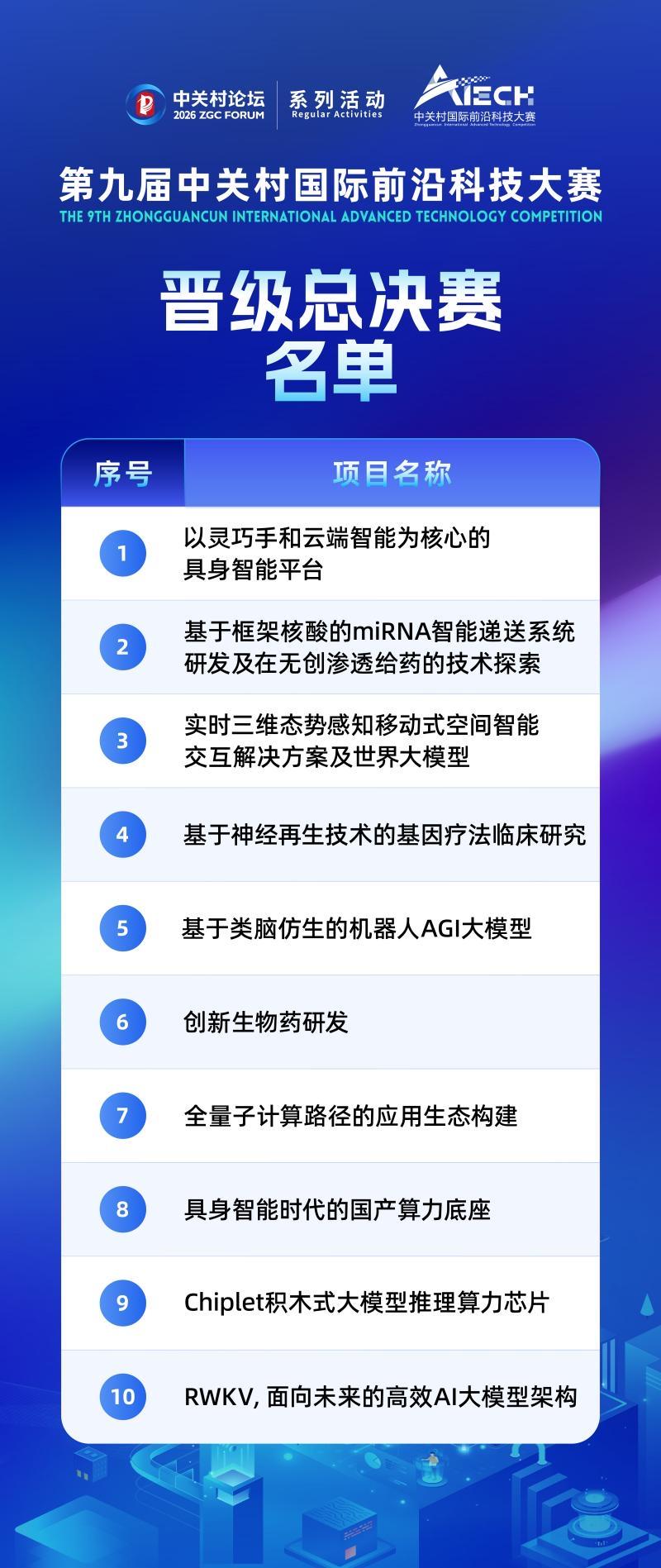 賽事邀請(qǐng)學(xué)術(shù)界、投資界與產(chǎn)業(yè)界的資深專家組成評(píng)審團(tuán)。評(píng)審過(guò)程中,專家們圍繞項(xiàng)目的技術(shù)先進(jìn)性、市場(chǎng)應(yīng)用前景等方面進(jìn)行綜合評(píng)審。經(jīng)評(píng)審,半決賽前十名項(xiàng)目脫穎而出,晉級(jí)總決賽??倹Q賽將于3月26日正式舉辦。以下為半決賽前十名項(xiàng)目名單: