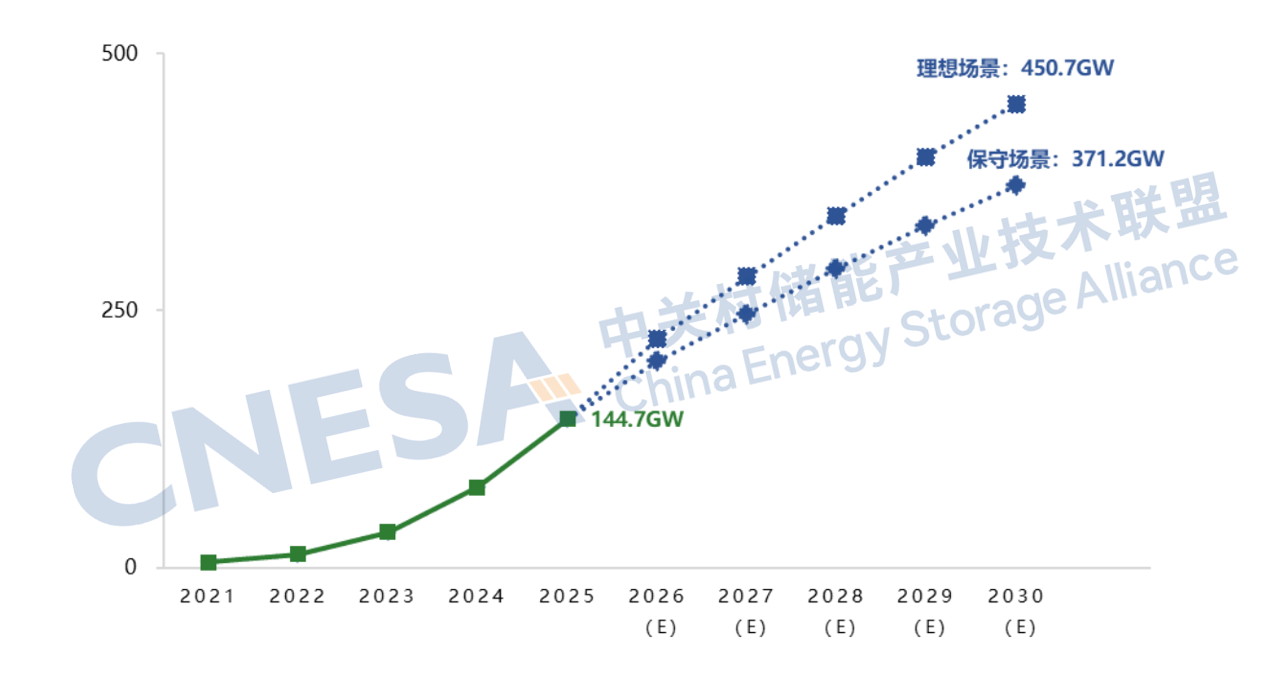 理想場景下,預(yù)計2030年新型儲能累計規(guī)模將達到450.7GW,2026-2030年復(fù)合年均增長率(CAGR)為25.5%。