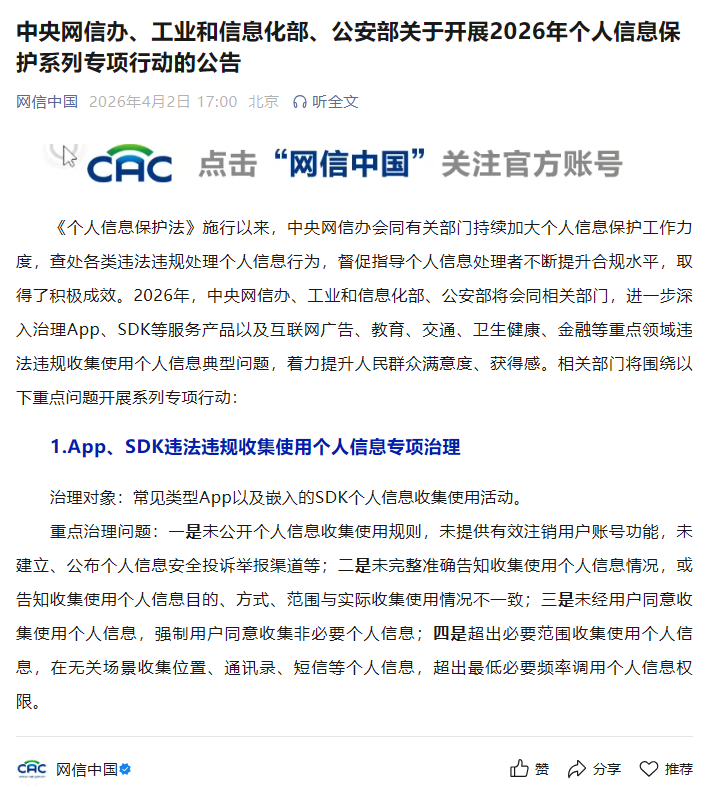 中央網(wǎng)信辦、工業(yè)和信息化部、公安部關(guān)于開(kāi)展2026年個(gè)人信息保護(hù)系列專項(xiàng)行動(dòng)的公告
