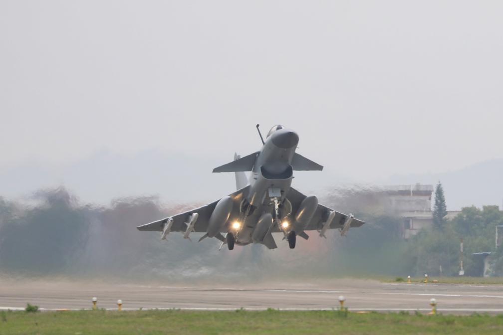 2023年4月8日,東部戰(zhàn)區(qū)圓滿完成環(huán)臺島戰(zhàn)備警巡和“聯(lián)合利劍”演習(xí)。這是殲擊機(jī)掛彈起飛。新華社發(fā)(王紫簫 攝)