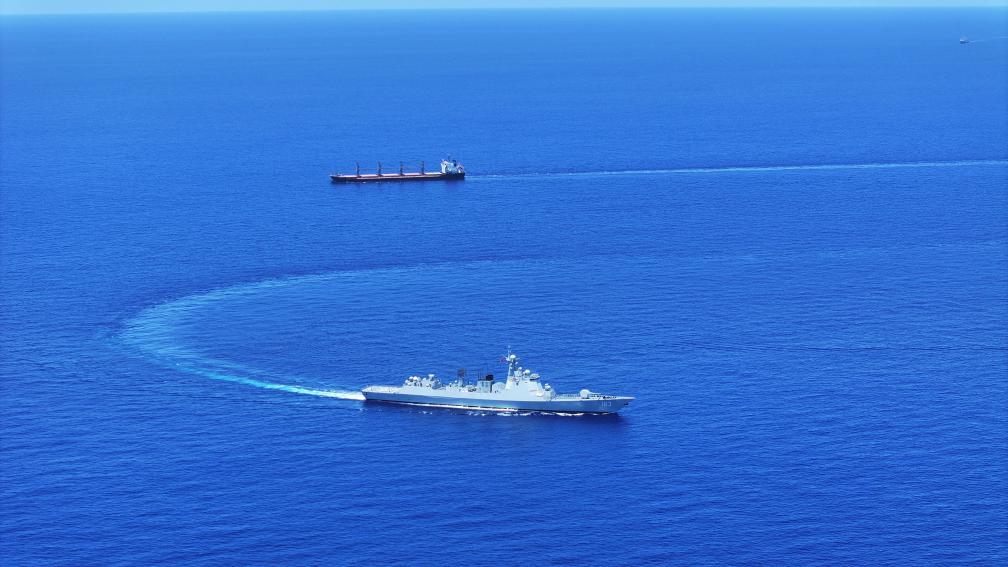 中國海軍第46批護(hù)航編隊(duì)焦作艦(下)護(hù)送貨船至解護(hù)點(diǎn)后與之分航(2024年5月7日攝)。新華社發(fā)(張大禹 攝)