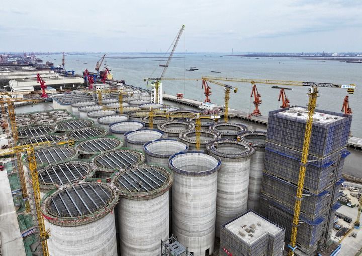 在江蘇省靖江市拍攝的中糧靖江碼頭倉儲(chǔ)物流項(xiàng)目建設(shè)現(xiàn)場(2025年2月20日攝,無人機(jī)照片)。新華社發(fā)(顧繼紅攝)