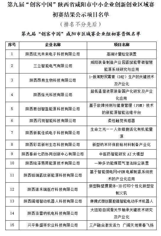 8月19日,由咸陽市工業(yè)和信息化局、咸陽市財政局、咸陽高新區(qū)管委會主辦,咸陽高新技術(shù)創(chuàng)業(yè)服務(wù)中心、咸陽高新創(chuàng)新科技孵化器有限公司承辦的第九屆“創(chuàng)客中國”陜西省咸陽市中小企業(yè)創(chuàng)新創(chuàng)業(yè)區(qū)域賽初賽評審結(jié)果出爐。
