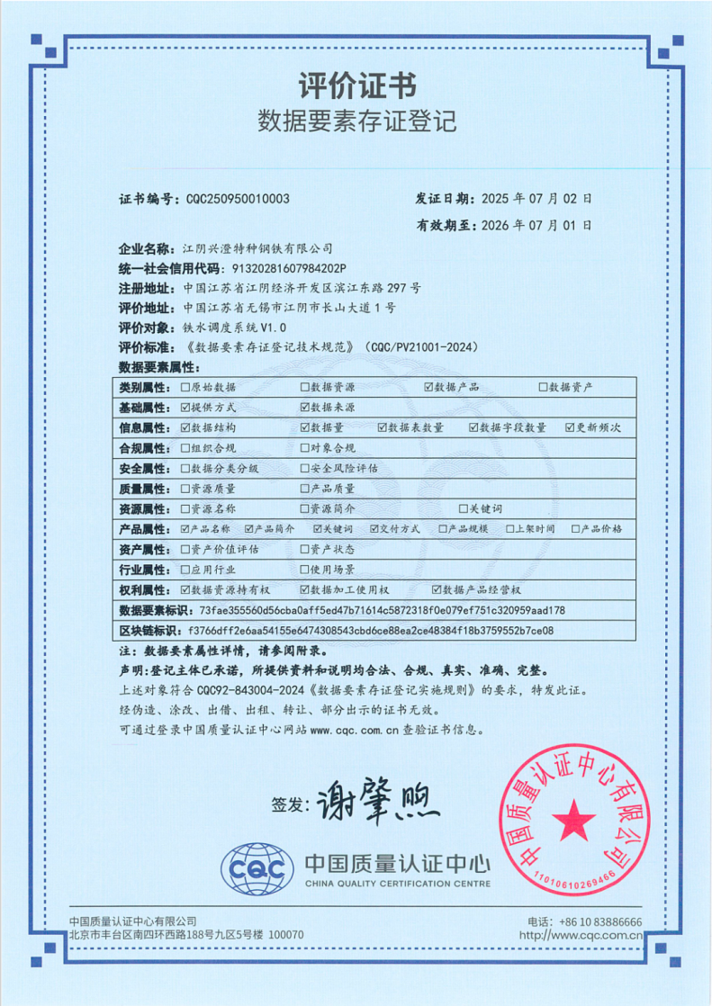 近日,江陰高新區(qū)企業(yè)江陰興澄特種鋼鐵有限公司(以下簡稱“興澄特鋼”)獲得由中國質(zhì)量認證中心(CQC)發(fā)放的數(shù)據(jù)要素存證登記證書,這是國內(nèi)鋼鐵行業(yè)首張數(shù)據(jù)要素存證登記證書(編號“003”)。