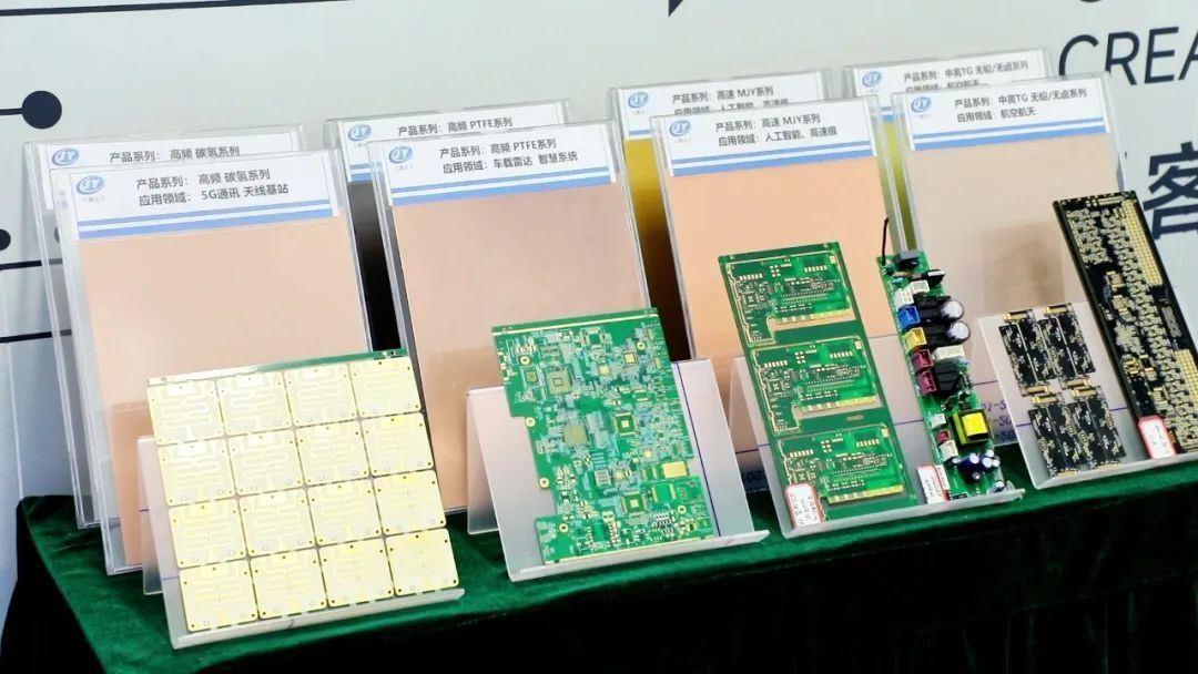 久耀電子科技(徐州)有限公司運(yùn)營副總監(jiān)彭海雷說:“這里展示的是我們覆銅板的幾類產(chǎn)品形態(tài)。其一,是通信類碳?xì)洚a(chǎn)品,主要用于通信信號(hào)傳輸;其二,是應(yīng)用于毫米波車載雷達(dá)領(lǐng)域的產(chǎn)品;其三,是在當(dāng)前熱門的AI算力算法領(lǐng)域應(yīng)用廣泛的產(chǎn)品類別;此外,還有適配航空航天等領(lǐng)域的產(chǎn)品,這類場景對(duì)板材的性能、穩(wěn)定性及質(zhì)量要求均較高。旁邊展示的是我們下游客戶的產(chǎn)品加工形態(tài)。我們會(huì)將全銅板形態(tài)的產(chǎn)品交付給客戶,客戶需自行蝕刻線路,去除多余部分以得到所需線路;后續(xù),客戶會(huì)進(jìn)行綠油涂覆、插件安裝等工序,最終將產(chǎn)品應(yīng)用于家用電器、機(jī)房高速設(shè)備等場景,服務(wù)于實(shí)際生活需求。”
