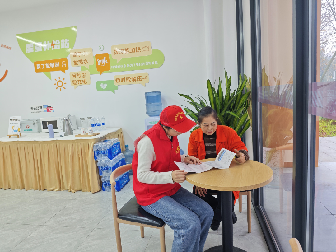 服務(wù)群眾,爭做“城市溫暖角”。紅色驛站秉持“民有所呼、我有所應(yīng)”的服務(wù)理念,聚焦戶外勞動者、周邊居民和師生的實際需求,配備免費飲水機、應(yīng)急藥箱、充電設(shè)備、微波爐等基礎(chǔ)設(shè)施,提供愛心雨傘、工具共享等暖心服務(wù),讓接送孩子的家長、往來師生和周邊居民在家門口就能享受到觸手可及的便利?!耙郧敖铀秃⒆?,遇到刮風下雨都沒地方待,現(xiàn)在好了,這個驛站太及時了!”一位正在驛站內(nèi)休息的學(xué)生家長高興地說。