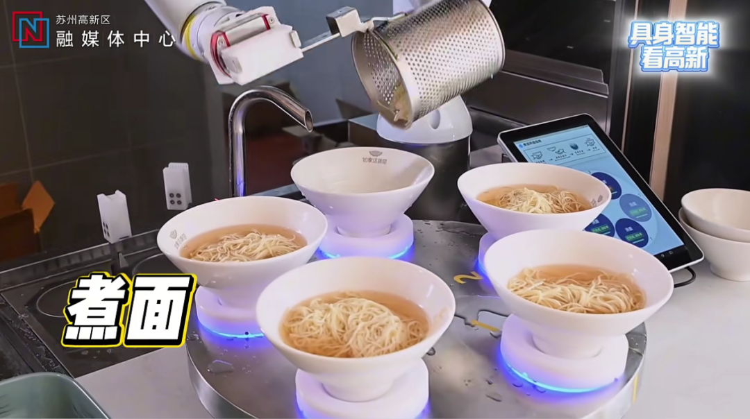 “取面、投面、煮面、加湯、取餐提醒”,云跡煮面機(jī)器人實現(xiàn)全流程包辦??腿藘H需完成放碗點(diǎn)單、取餐兩步操作,最快54秒的時間,一碗熱氣騰騰、香氣四溢的面條出鍋。同時借助AI溫控與軌跡優(yōu)化技術(shù),精準(zhǔn)維持面條口感與適宜溫度,相當(dāng)于1-2名熟練廚師的工作量。