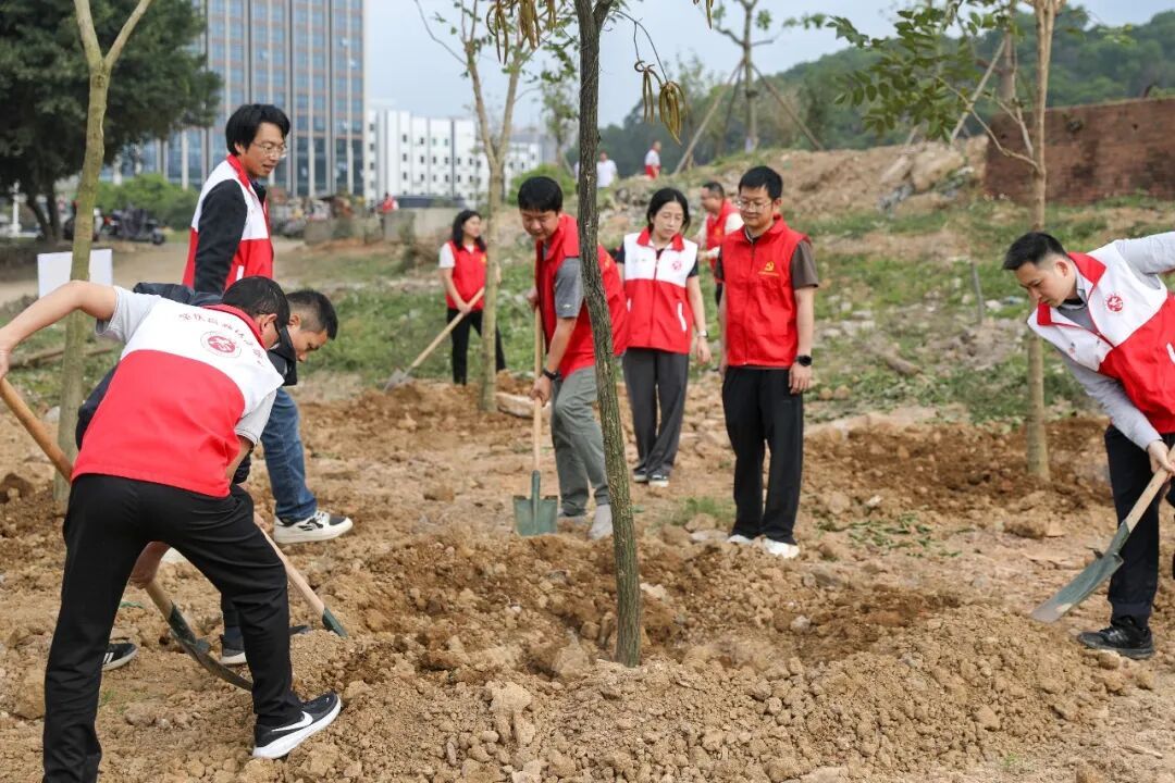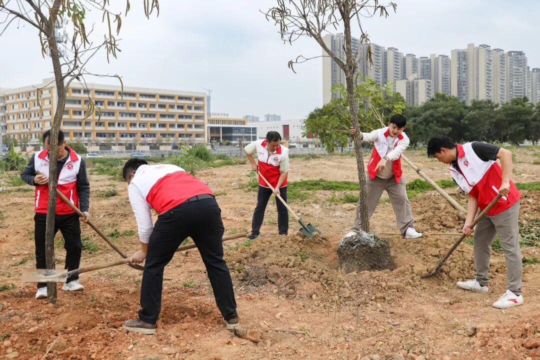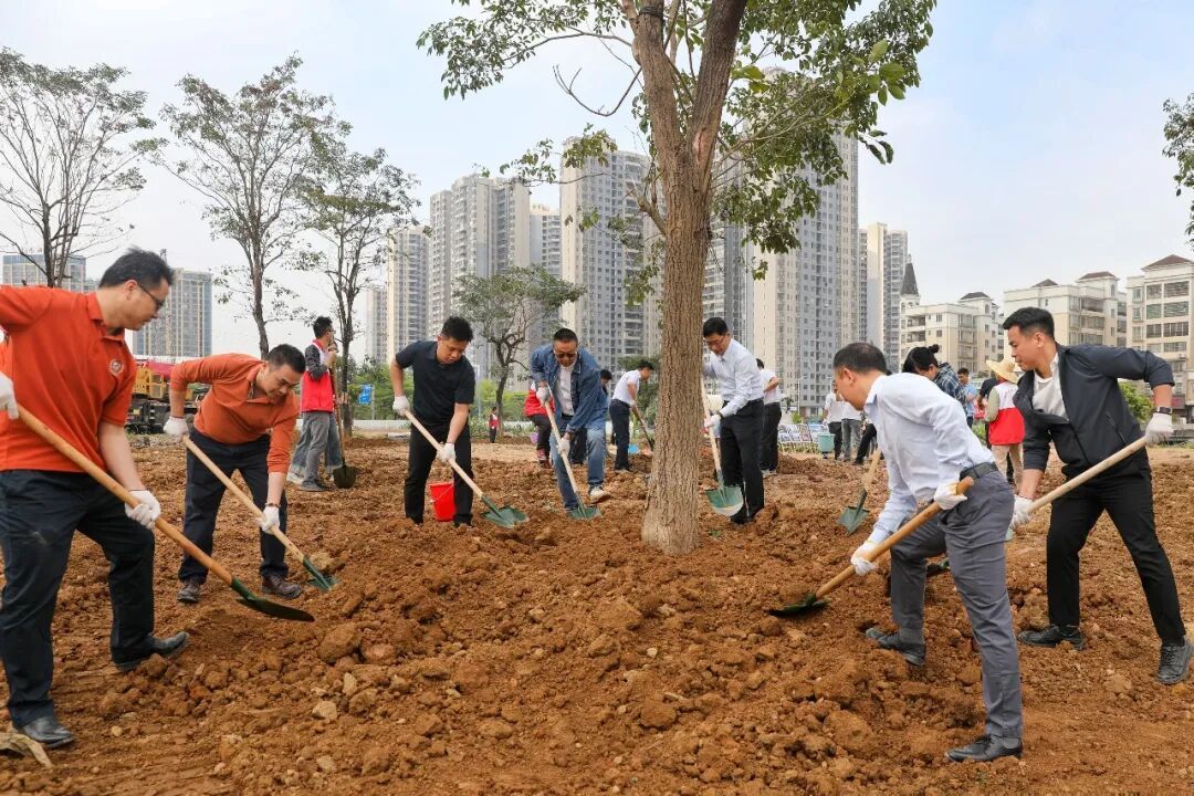 在植樹(shù)現(xiàn)場(chǎng),大家分工協(xié)作、配合默契,揮鍬鏟土、扶苗填坑、培土圍堰、提水澆灌……經(jīng)過(guò)共同努力,110株風(fēng)鈴木、火焰木、宮粉紫荊等鄉(xiāng)土樹(shù)種順利扎根沃土,為水系廣場(chǎng)增添點(diǎn)點(diǎn)新綠。