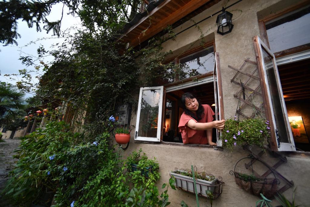 8月29日,在福建省屏南縣熙嶺鄉(xiāng),龍?zhí)洞濉靶麓迕瘛泵泛暝诖蚶碜约航?jīng)營(yíng)的民宿外墻裝飾花盆。新華社記者姜克紅 攝
