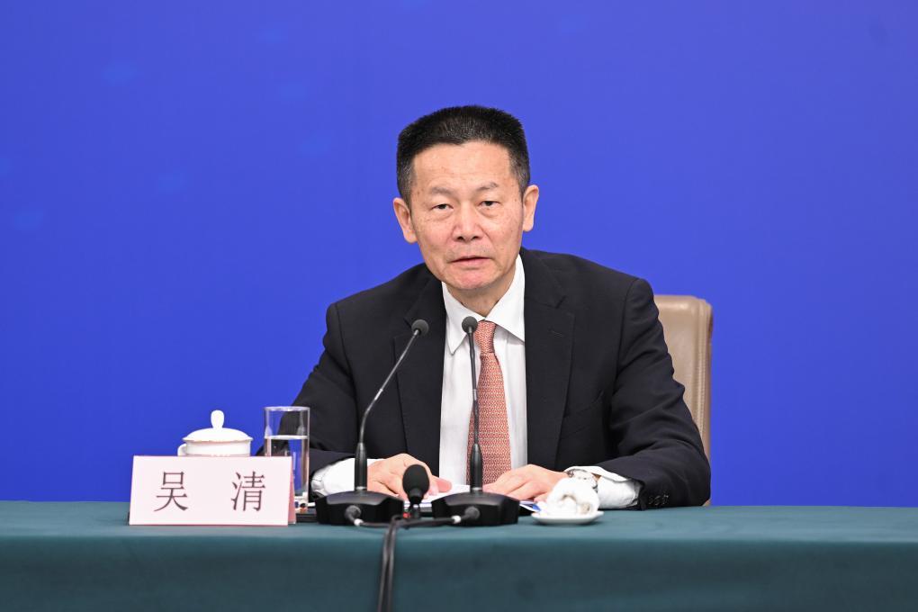 3月6日,十四屆全國人大三次會議在北京梅地亞中心新聞發(fā)布廳舉行記者會。國家發(fā)展和改革委員會主任鄭柵潔、財政部部長藍(lán)佛安、商務(wù)部部長王文濤、中國人民銀行行長潘功勝、中國證券監(jiān)督管理委員會主席吳清就發(fā)展改革、財政預(yù)算、商務(wù)、金融證券等相關(guān)問題回答中外記者提問。這是吳清在回答記者提問。