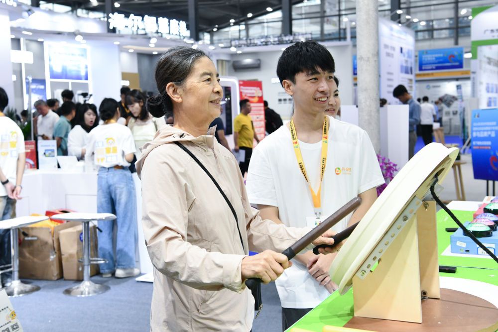 2024年10月27日,老人在2024深圳國際智慧養(yǎng)老產(chǎn)業(yè)博覽會上體驗樂齡鼓。新華社記者 梁旭 攝