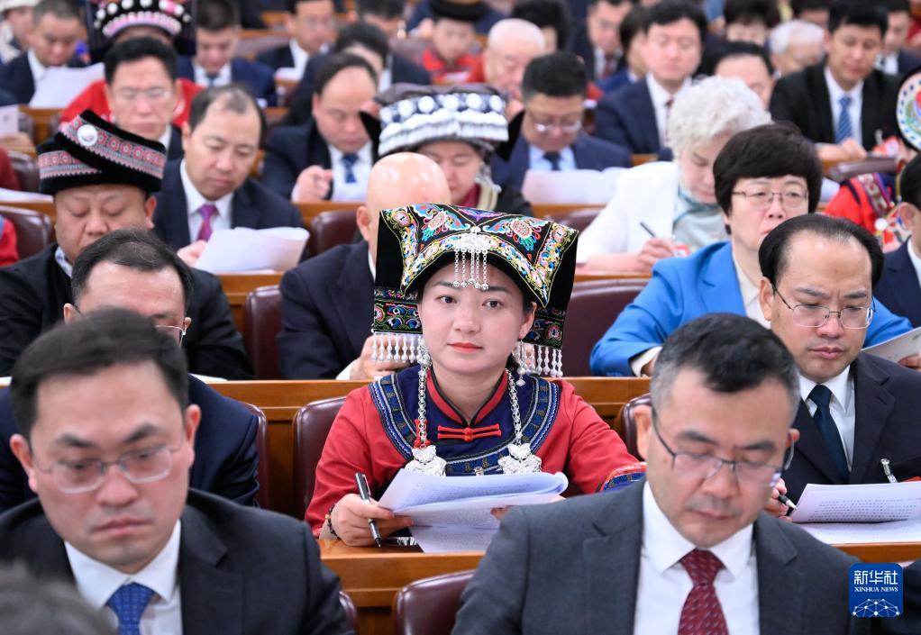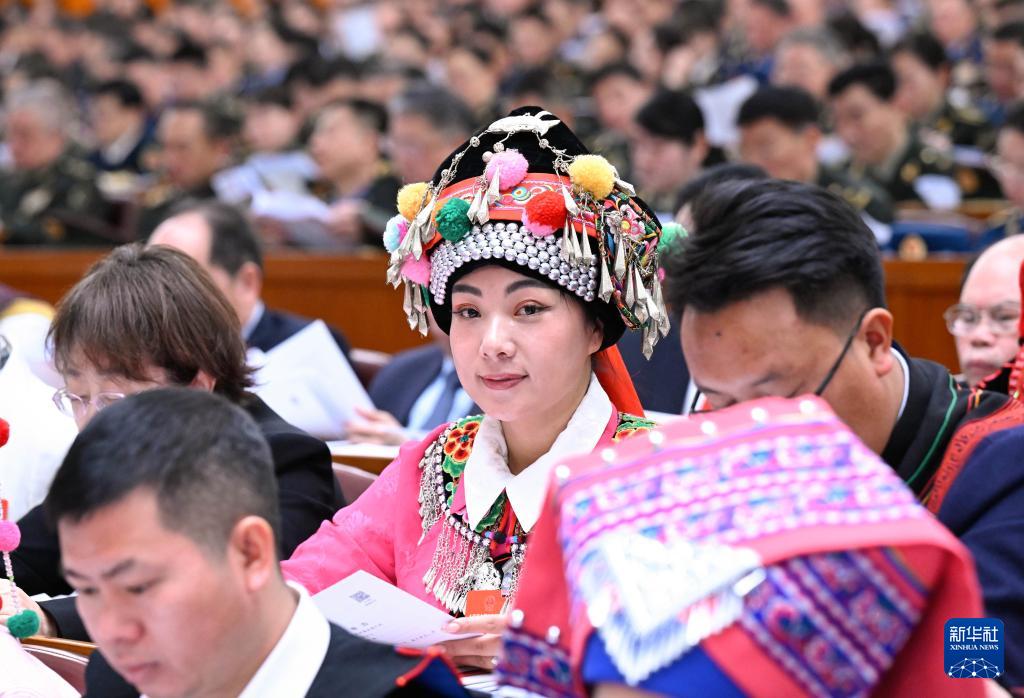 3月5日,全國人大代表、云南省南澗彝族自治縣民族文化工作隊隊員魯麗華在北京人民大會堂出席十四屆全國人大三次會議開幕會。