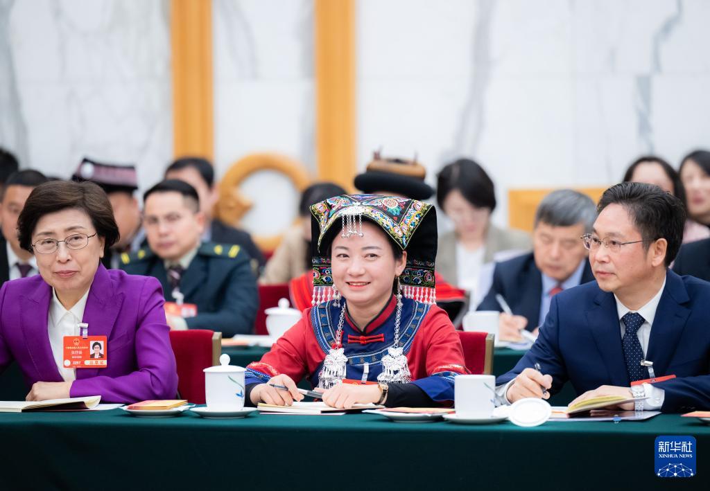 3月5日,全國人大代表、貴州省安順市鎮(zhèn)寧布依族苗族自治縣六馬鎮(zhèn)致富村黨支部書記、村委會主任盧丹(中)在北京出席十四屆全國人大三次會議貴州代表團(tuán)全體會議。