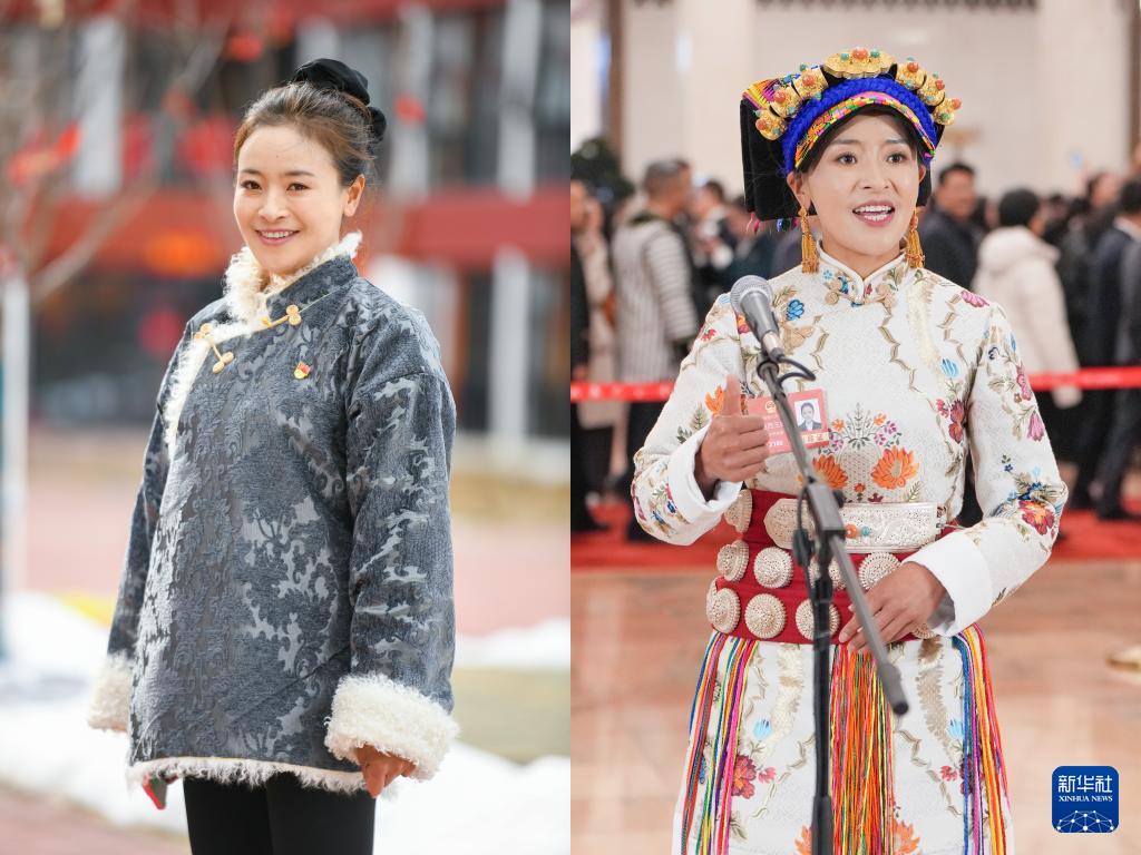 拼版照片:左圖為在云南省南澗彝族自治縣寶華鎮(zhèn)擁政村拍攝的全國人大代表、南澗彝族自治縣民族文化工作隊隊員魯麗華(新華社記者陳欣波2025年2月7日攝);右圖為在十四屆全國人大三次會議云南代表團(tuán)駐地拍攝的魯麗華(新華社記者鄭煥松2025年3月6日攝)。