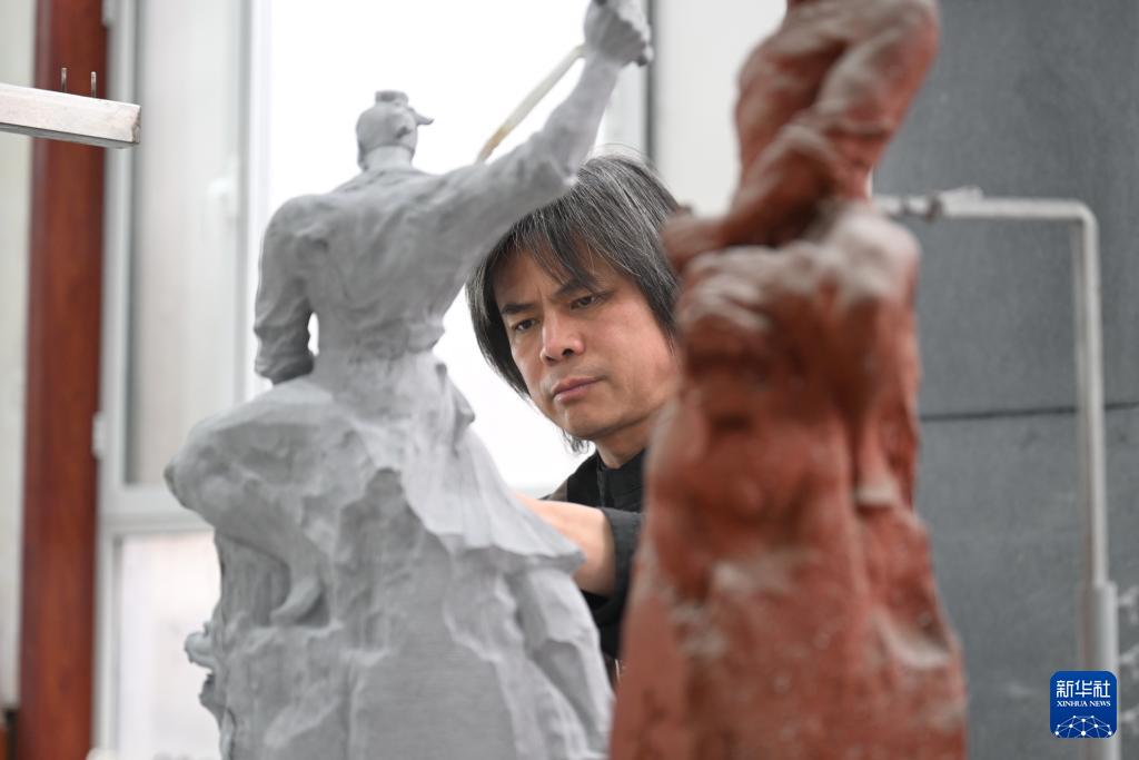 全國政協(xié)委員、河北翰鼎雕塑集團(tuán)首席技師高英坡在河北省曲陽縣的工作室進(jìn)行雕塑創(chuàng)作(2025年2月21日攝)。