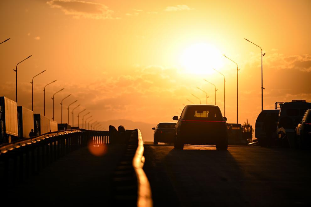 運(yùn)輸公司工作人員將中國(guó)新能源車從霍爾果斯運(yùn)向哈薩克斯坦一側(cè)中轉(zhuǎn)停車場(chǎng)。新華社記者 李任滋 攝