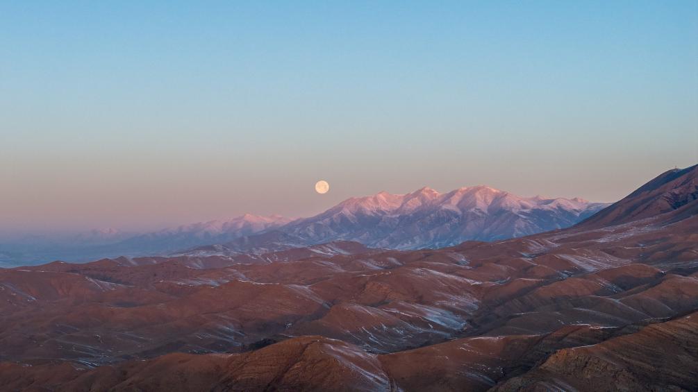 這是1月14日在新烏鞘嶺隧道附近拍攝的山脈與月亮(無(wú)人機(jī)照片)。新華社記者 郎兵兵 攝