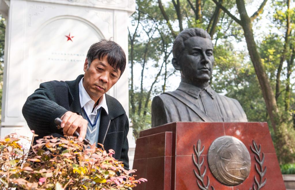 2014年11月19日,守陵人魏映祥在庫(kù)里申科烈士陵園內(nèi)庫(kù)里申科烈士雕像前修剪陵園內(nèi)的苗木。新華社記者 劉潺 攝