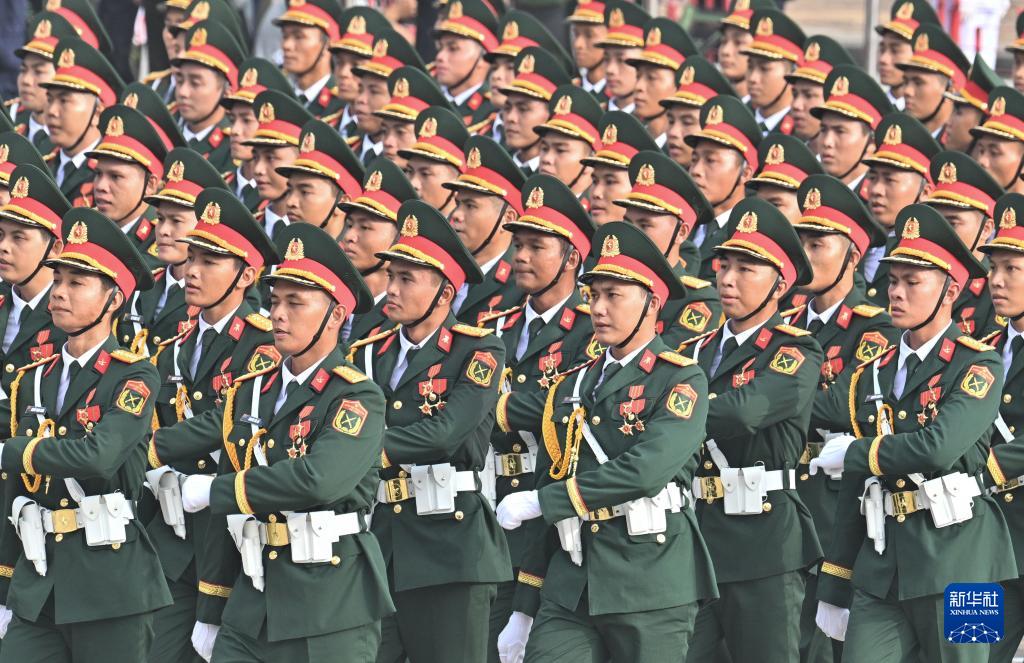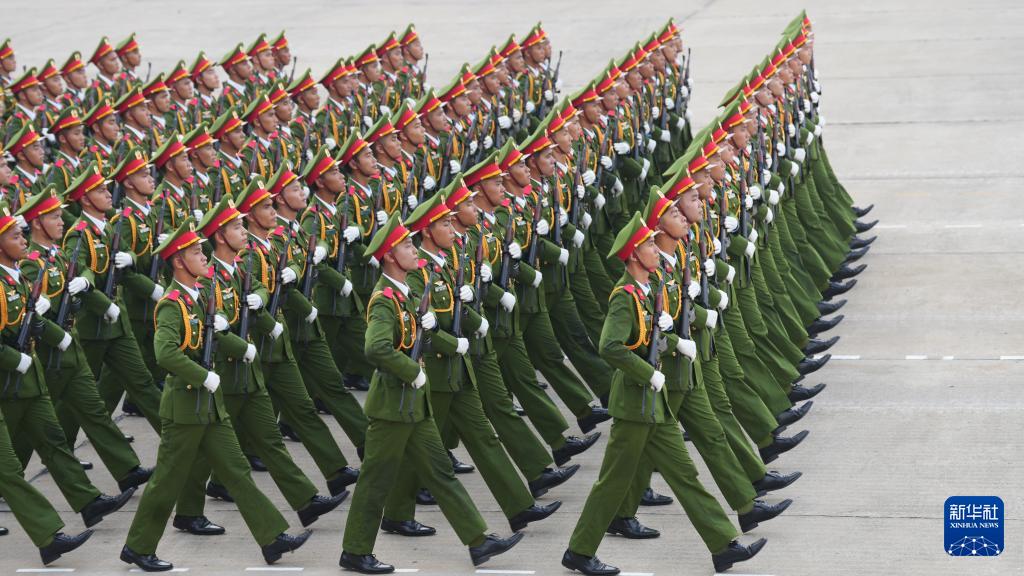 9月2日,在越南河內巴亭廣場,越南軍隊方陣走向主席臺接受檢閱。新華社記者 胡佳麗 攝