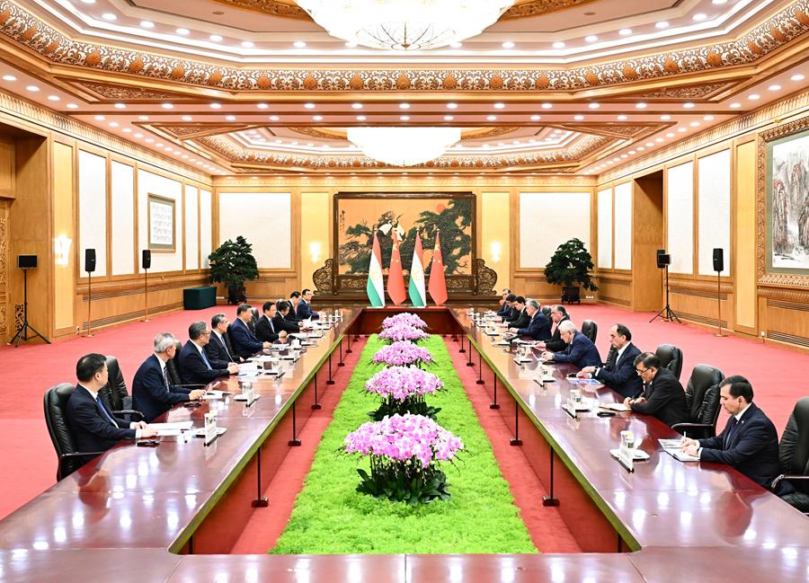 9月2日晚,國家主席習(xí)近平在北京人民大會堂會見來華出席2025年上海合作組織峰會和紀(jì)念中國人民抗日戰(zhàn)爭暨世界反法西斯戰(zhàn)爭勝利80周年活動的塔吉克斯坦總統(tǒng)拉赫蒙。新華社記者 燕雁 攝