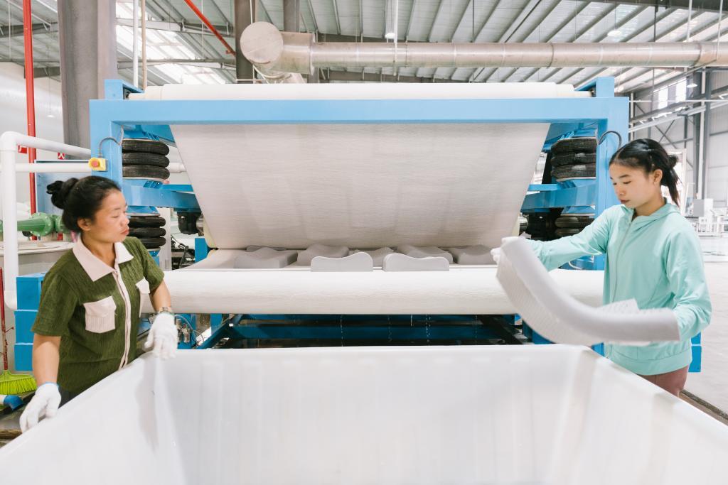 在西雙版納勐巴拉娜西乳膠制品有限公司,工人正在制作乳膠床上用品。(查巍 攝)