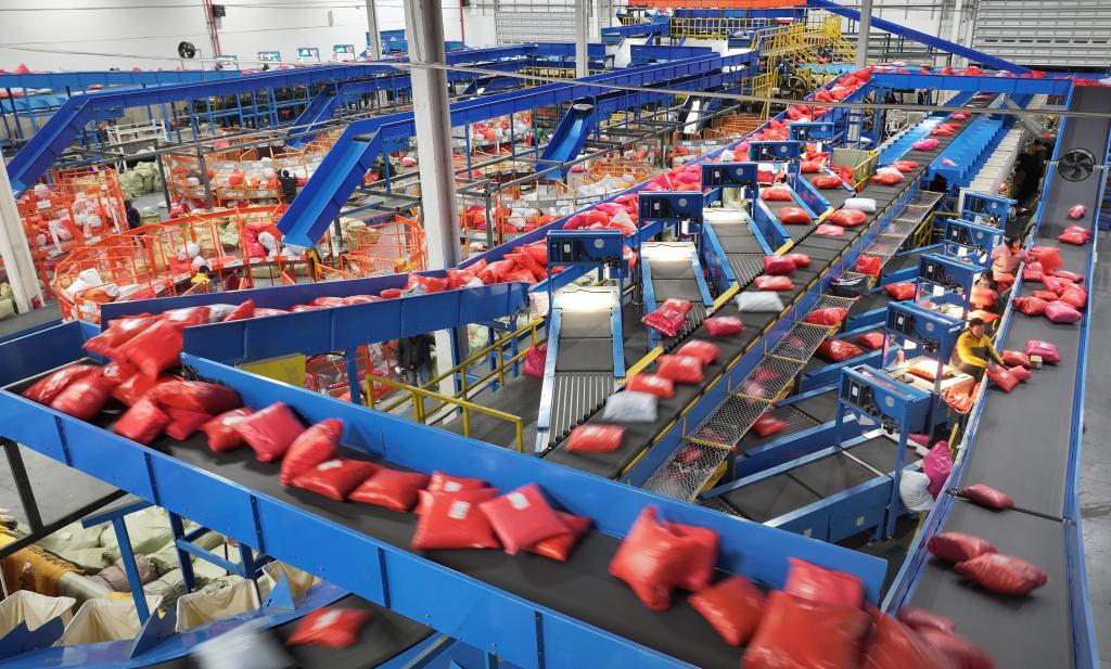 在江蘇南通一家國際物流園分揀中心,工作人員在分揀貨物(2023年12月20日攝,無人機(jī)照片)?!笆奈濉逼陂g,面對(duì)地緣政治風(fēng)險(xiǎn)和貿(mào)易壁壘,我國以跨境電商、保稅維修、市場采購等為代表的新業(yè)態(tài)新模式助力各國消費(fèi)者、生產(chǎn)者“買全球、賣全球”,成為穩(wěn)外貿(mào)的重要引擎。