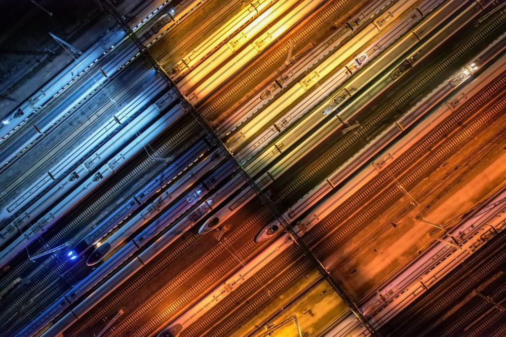 動(dòng)車組列車??吭谫F陽北動(dòng)車所內(nèi)(2023年1月6日攝,無人機(jī)照片)?!笆奈濉逼陂g,我國建成世界規(guī)模最大、先進(jìn)發(fā)達(dá)的高速鐵路網(wǎng)。