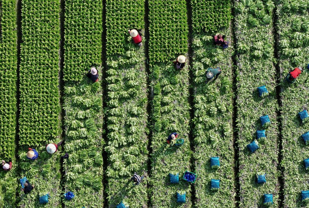 2026年2月24日,農(nóng)民在四川彭州市九尺鎮(zhèn)玉源社區(qū)的田地里采收油麥菜(無人機照片)。新華社發(fā)(羅國楊 攝)